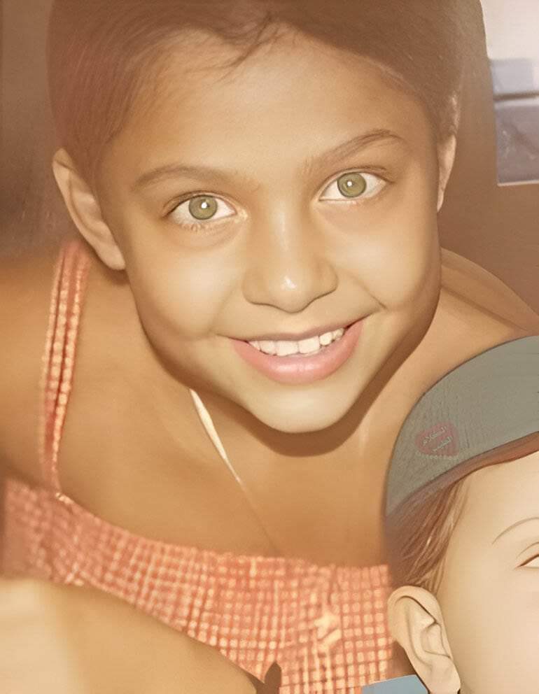 في طفولتها، لا يمكن لأحد إنكار جمال ملامحها، فهي كانت طفلة سمراء ذات شعر |Шــgد كثيف مع خدود بارزة وناعمة وعينين واسعتين تشع منهما البراءة والجاذبية، أما شفـ، ،ـتيهـ| فكانتا بارزتين وجميلتين جداً.